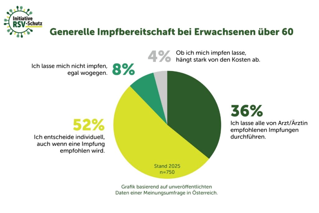 Im österreichischen Impfplan ist RSV seit Kurzem für Personen ab 60 Jahren empfohlen. Die tatsächliche Durchimpfungsrate liegt jedoch im sehr niedrigen einstelligen Bereich. Immerhin: 23 Prozent der über 60-Jährigen kennen bereits die Möglichkeit eines Impfschutzes – ein Zuwachs von 8 Prozentpunkten gegenüber dem Vorjahr.