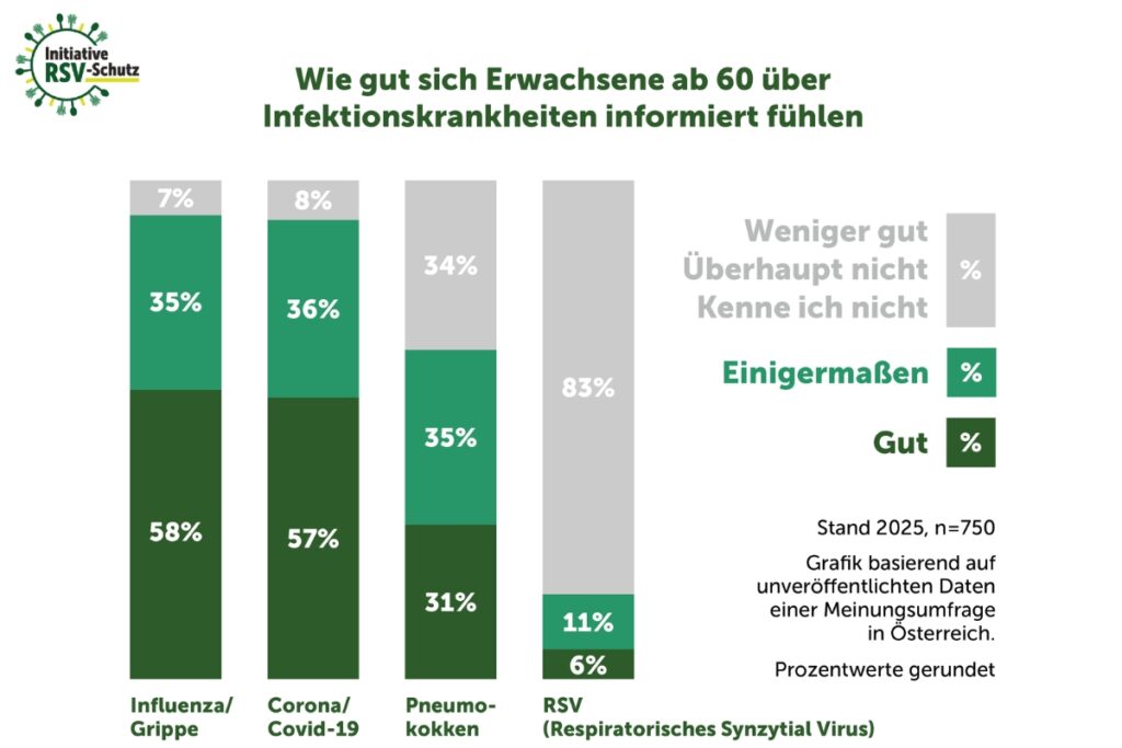 Eine aktuelle Umfrage zeigt: In Österreich besteht bei über 60-Jährigen eine erhebliche Informationslücke rund um das Respiratorische Synzytial-Virus (RSV). Eine Erkrankung damit kann jedoch schwere Verläufe verursachen – besonders bei bestehenden Grunderkrankungen.